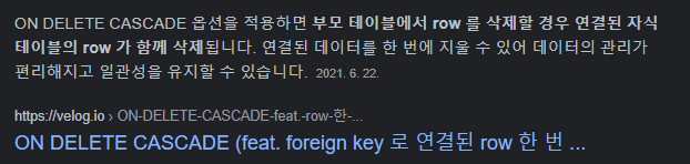 ON DELETE CASCADE를 하는 이유는, 부모테이블 ROW와 자식테이블 ROW를 함께 연결하기위해서이다.