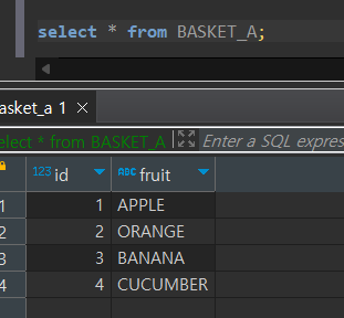 각 ID와 FRUIT을 BASKET_A와 BASKET_B로 구분하기 위하여 각각 A, B로 이름을 지정해주었다.