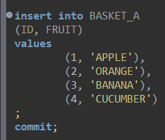그 다음 BASKET_A와 B에 각각 과일의 종류를 넣어주는 INSERT문을 작성한다.